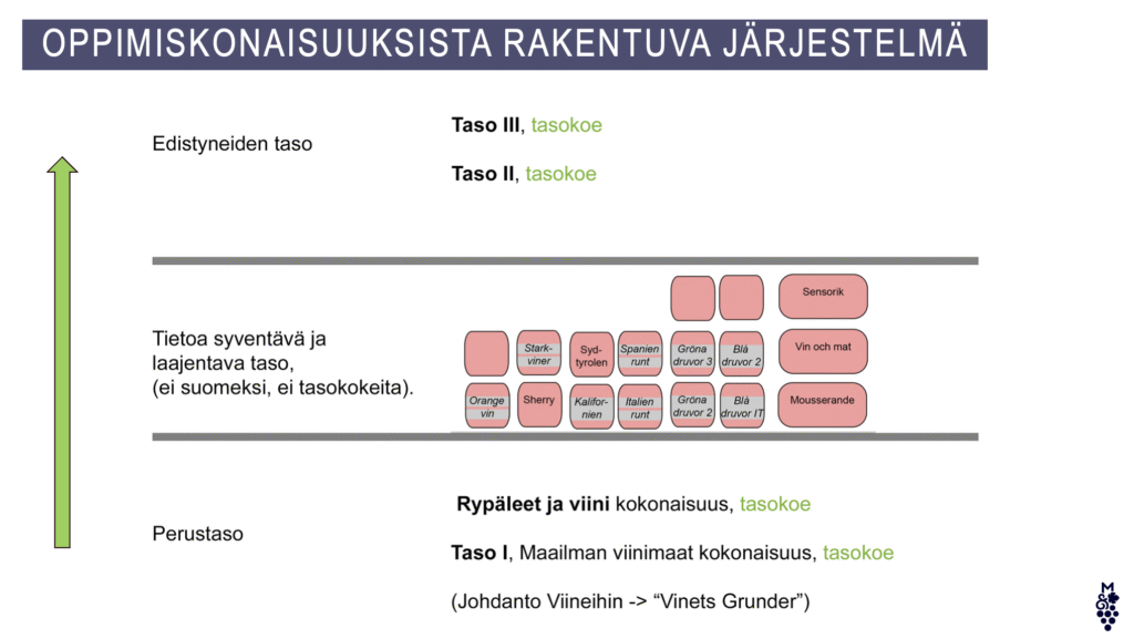 Paikallisyhdistykset järjestävät koulutusta neljällä tasolla Munskänkarnan yhteisten voimassa olevien oppimistavoitteiden mukaisesti. Kurssien jälkeen osanottajilla on mahdollisuus suorittaa tasokoe. Tasokokeen läpäisseet saavat diplomin ja suoritusta vastaavan rintamerkin. Lisäksi käytössä on erikoismateriaalia mm. väkevöityjen, oranssien ja kuohuviinien teemalla, sekä ruuan ja viinin yhdistämiseen.